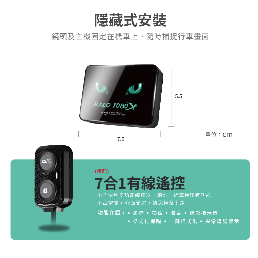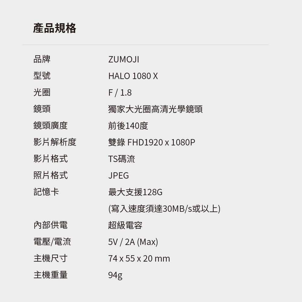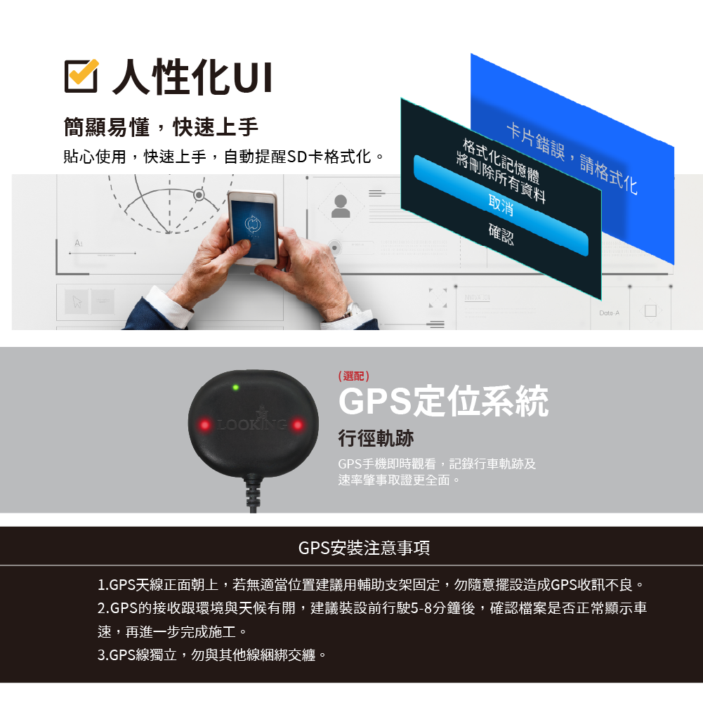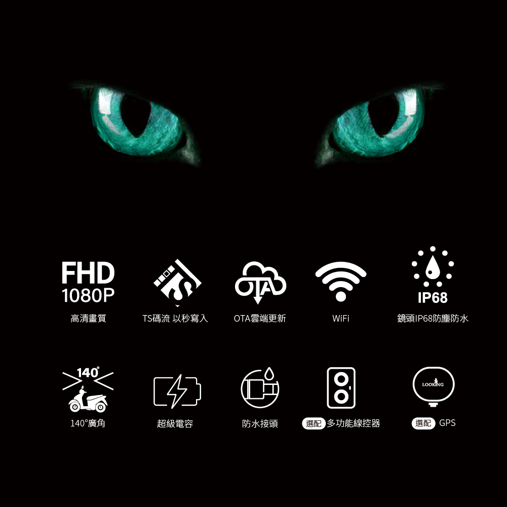 一鍵鎖檔、一鍵拍照、一鍵格式化、麥克風收音、錄影指示燈、記憶卡格式化提醒及異常警示功能