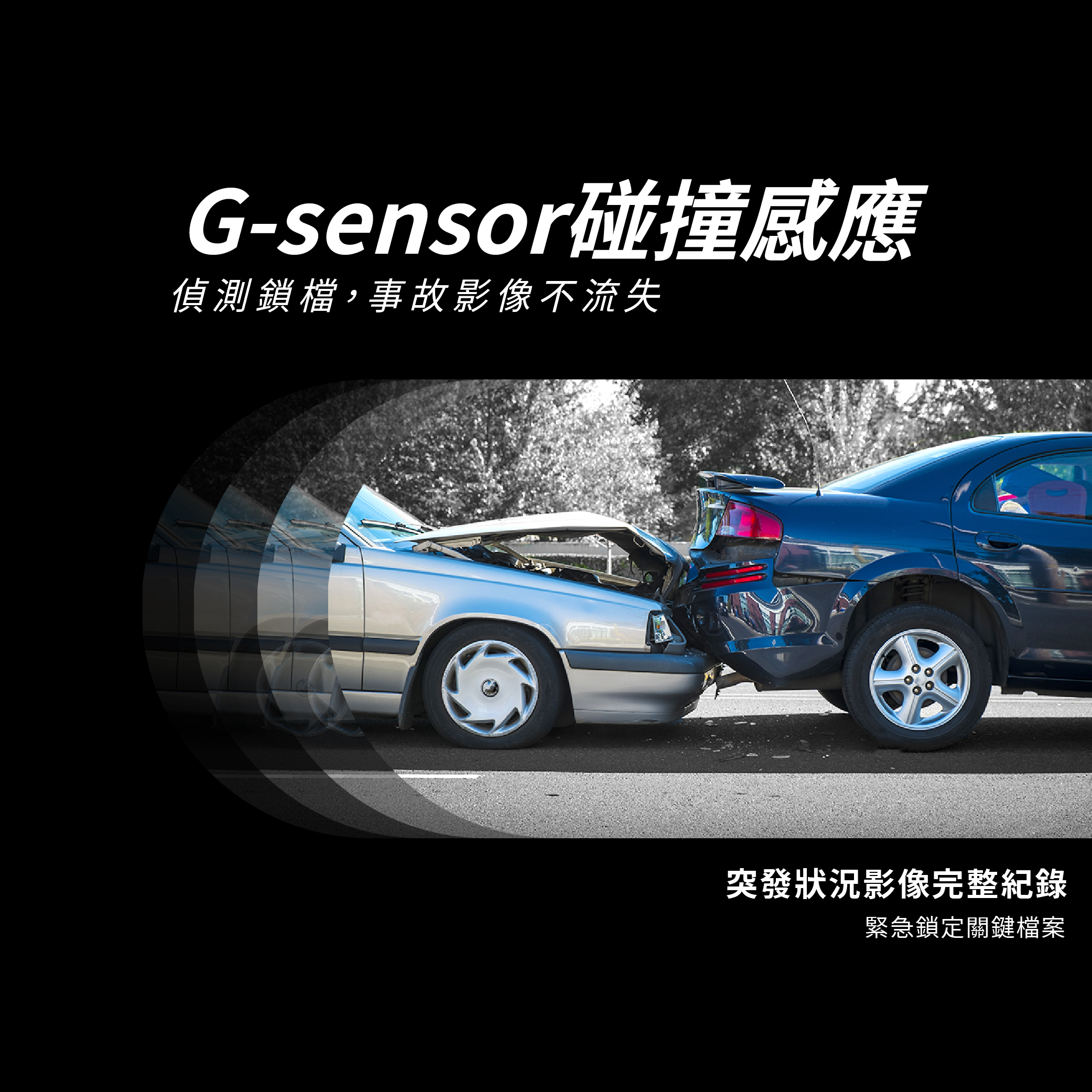 ☑G-sensor 碰撞感應,自動保存重要影像