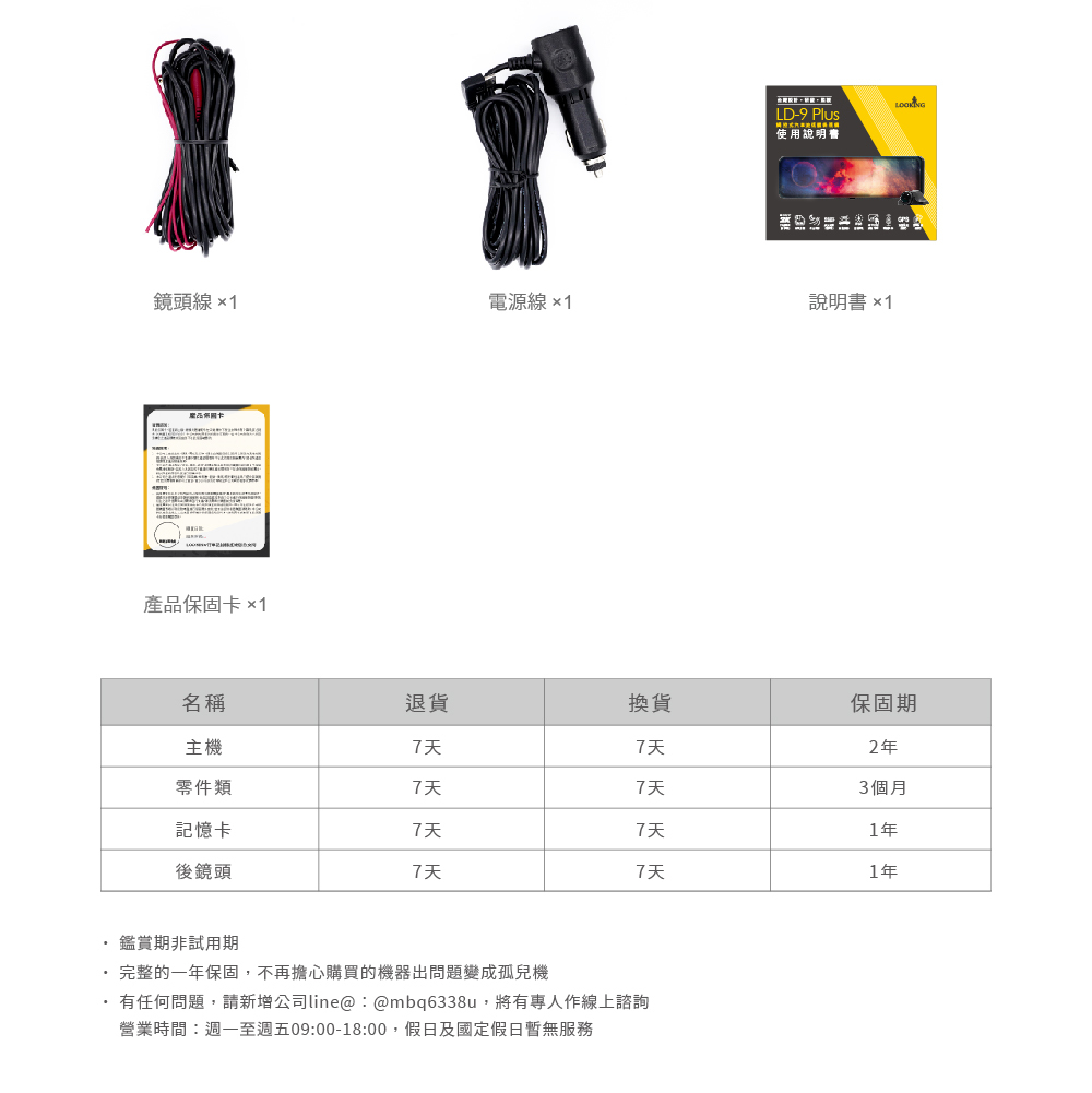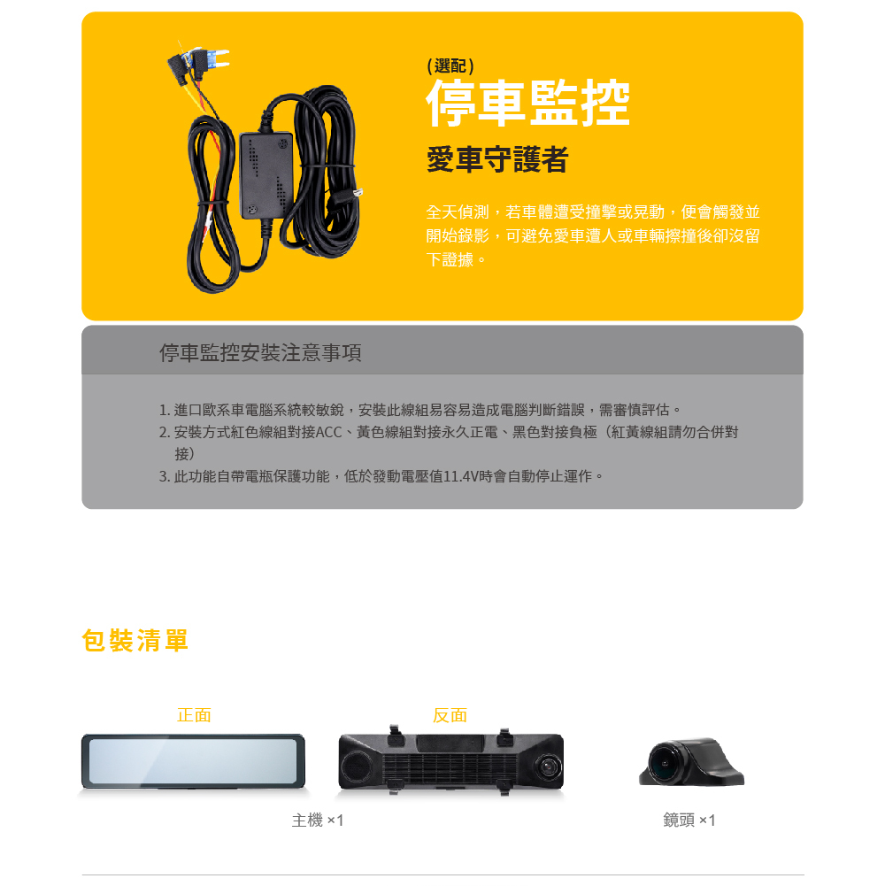 5.配件:後視鏡行車紀錄器、說明書、產品保固卡、車充、後鏡頭